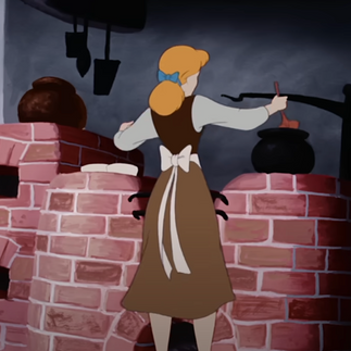 We see Cinderella -- much like Snow White -- at the stove/hearth preparing something out of a big pot (the internet seems to agree that it's porridge, which makes sense--the family's fortune has evaporated, so porridge would be the cheaper option).
